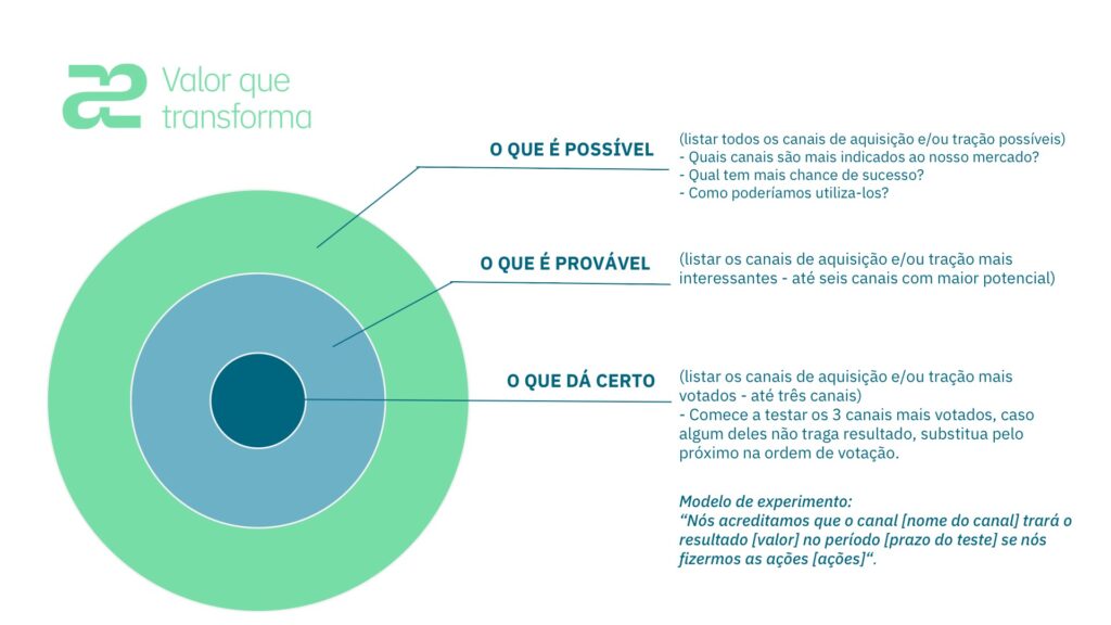 Uma vez identificados, é fundamental selecionar os seis canais com maior potencial para o seu mercado específico. Para te ajudar ainda mais, o livro “Tração: Domine os 19 Canais que uma Startup Usa para Atingir Aumento Exponencial em sua Base de Clientes“, de Gabriel Weinberg e Justin Mares, identifica 19 canais de aquisição.